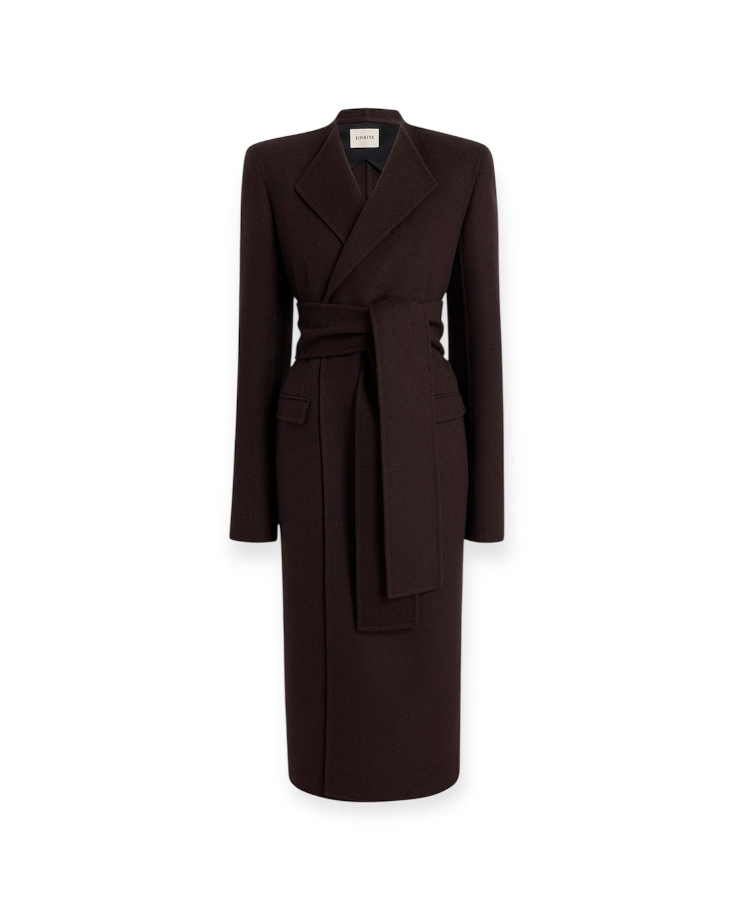 A clean-lined coat made from double-faced wool that holds its shape while remaining soft. The seam-free collar creates a scarf-like drape around the neck. Wide sash belt allows for customizable fit at the waist. Made from Italian wool that’s primarily recycled, with construction that creates two finished sides for warmth without bulk.